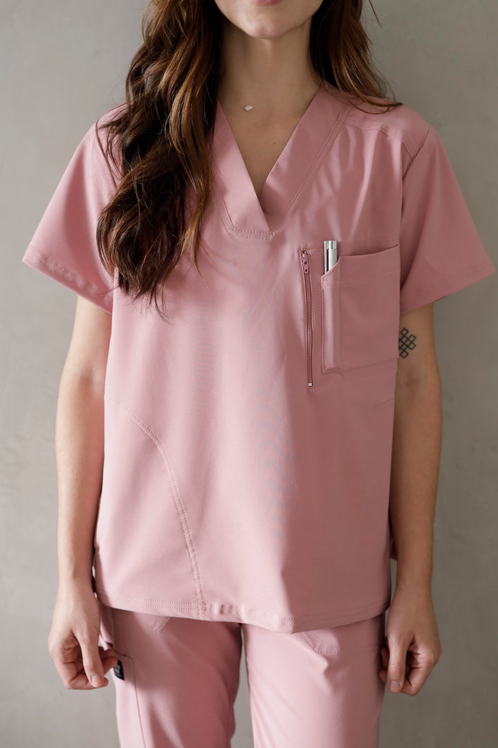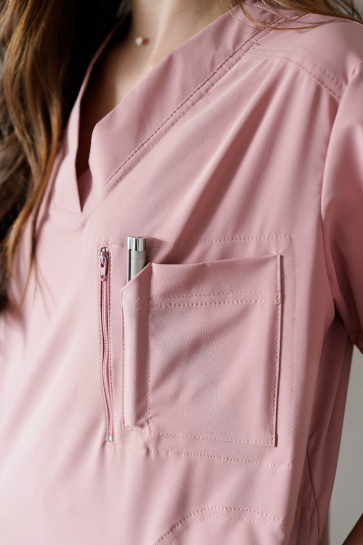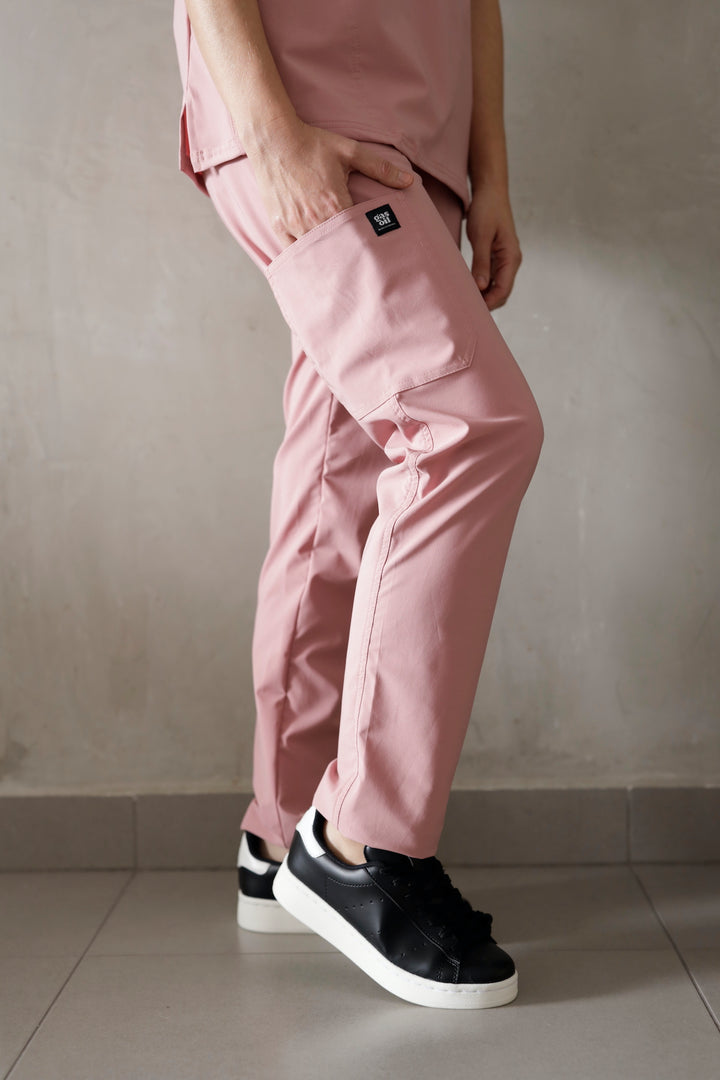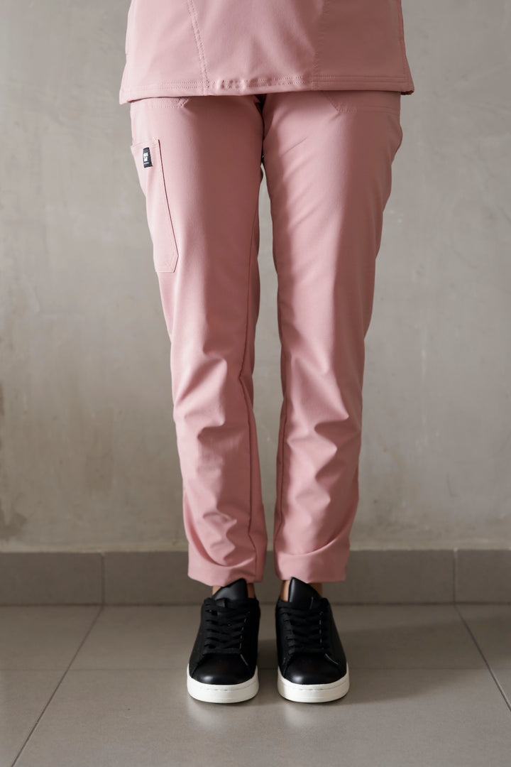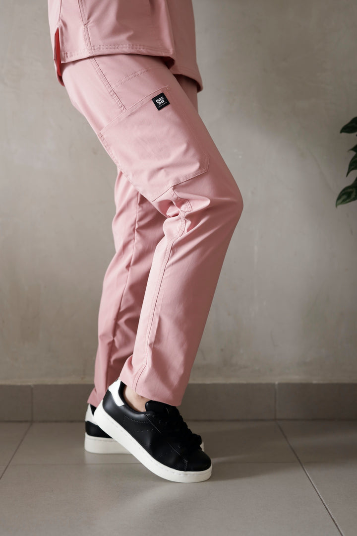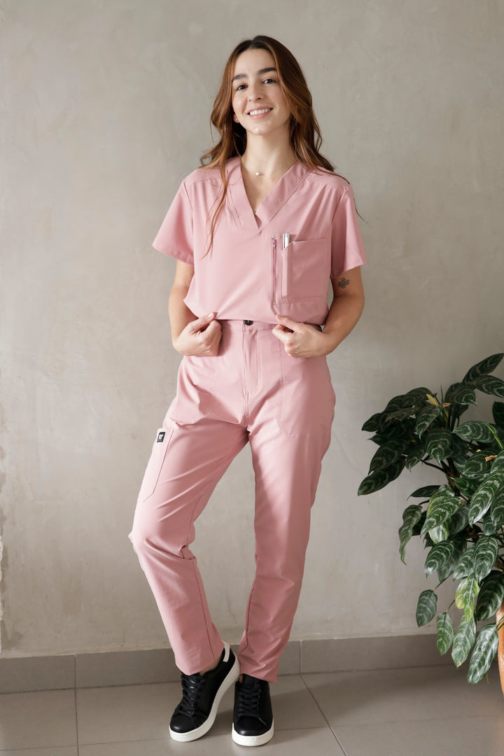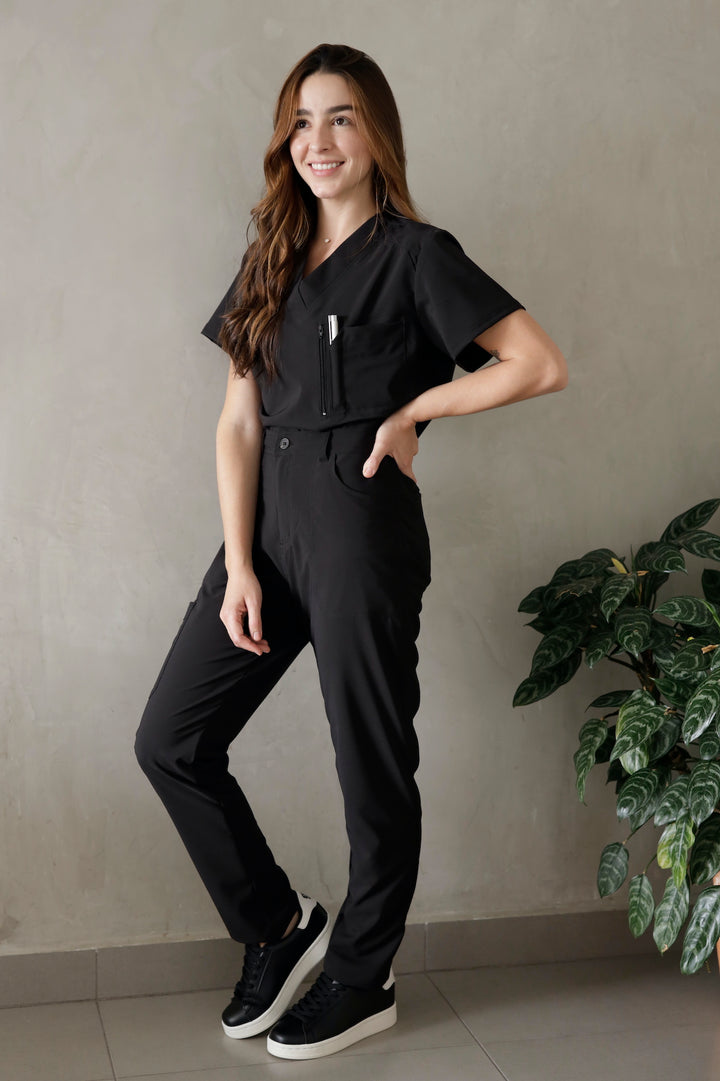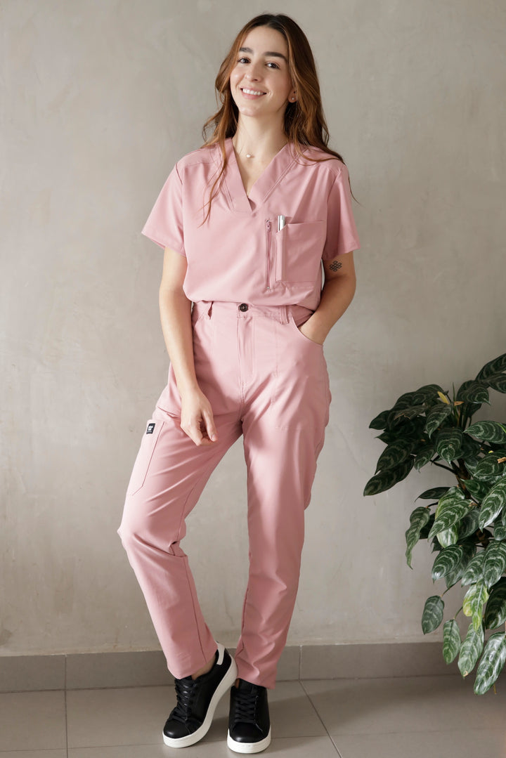 Blusón con diseño cuello V, manga corta y dos bolsillos, pantalón tipo jogger tiro alto, con pretina resortada y cordón ajustable, dos bolsillos laterales y bota resortada.